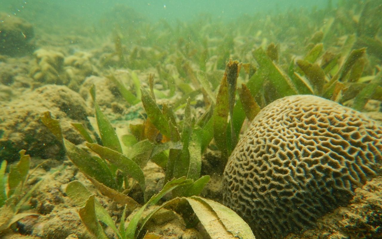 Lamun jenis Thalassia hemprichii tumbuh di sekitar karang